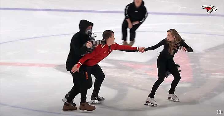 Когда Радионова решила встать в пару с игроком (хотя она одиночница, в паре не каталась), то вышло совсем смешно: Шарипзянов чуть не сбил с ног одного из операторов.