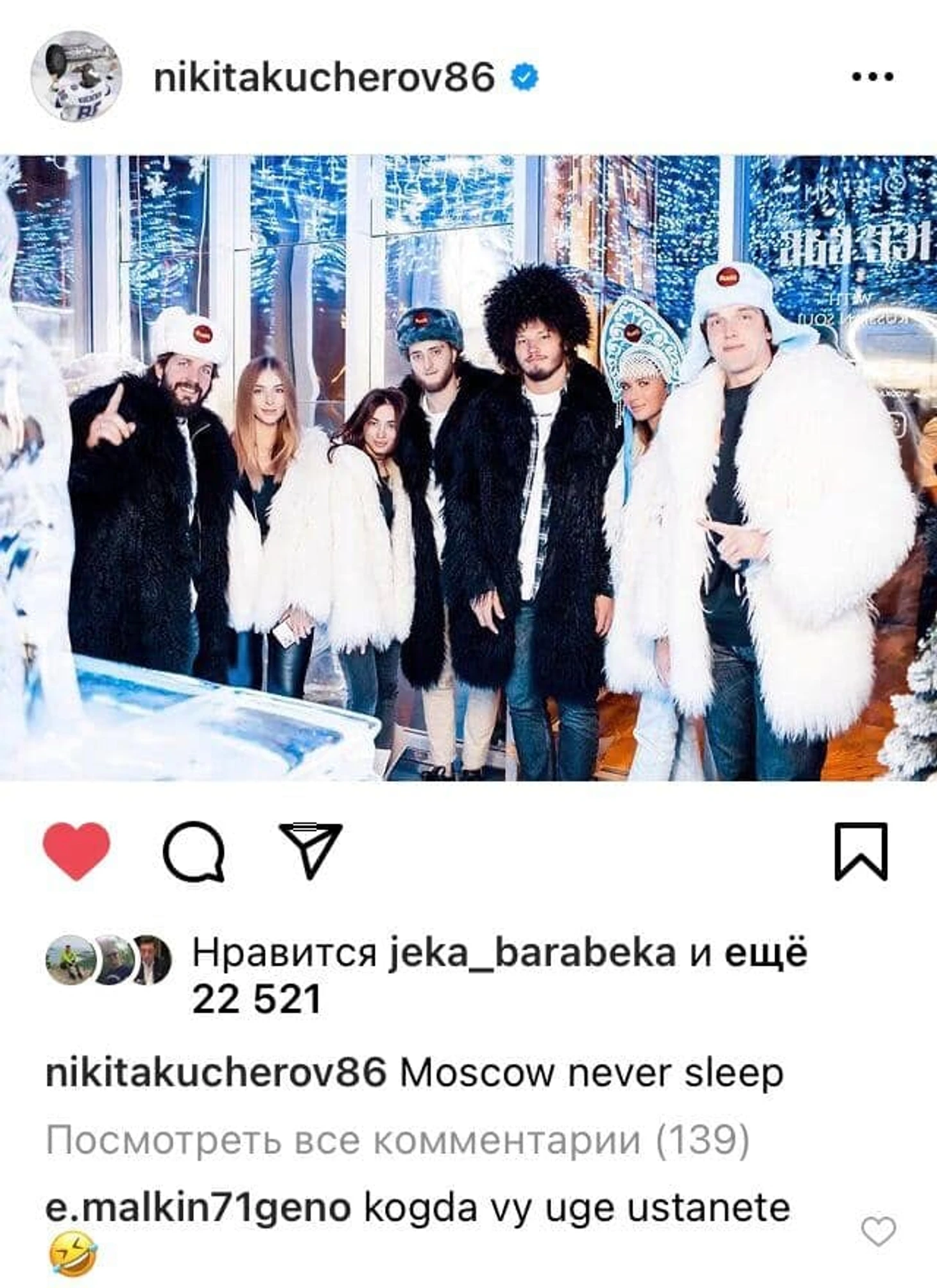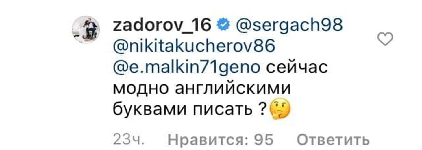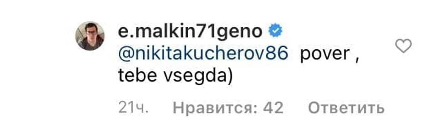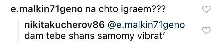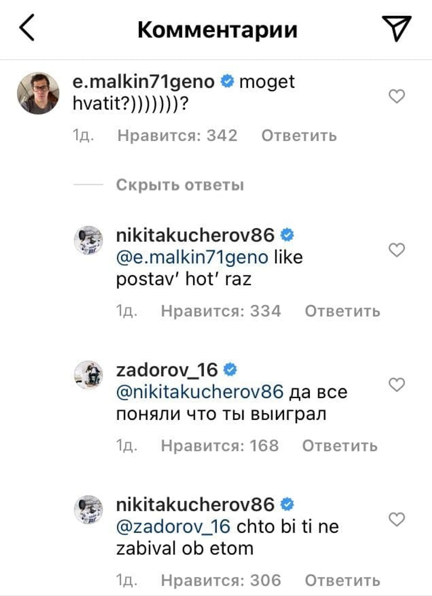 Кучерова с кубком в инстаграме стало так много, что Евгений Малкин и Никита Задоров не смогли пройти мимо свежей фотографии. В итоге получился забавный диалог с чемпионами – самим Кучеровым и Михаилом Сергачевым.