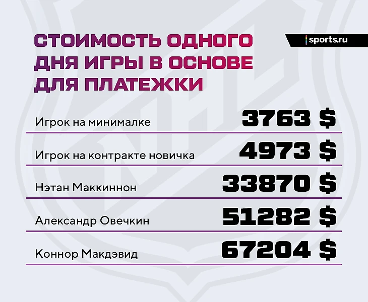 Весь сезон НХЛ состоит из 186 «рабочих дней» – учитываются не только дни матчей, но и тренировки. Соответственно, начисления производятся после каждого из этих дней в виде 1/186 кэпхита. Минимальная зарплата в лиге – 700 тысяч долларов, самый большой кэпхит – 12,5 миллионов.