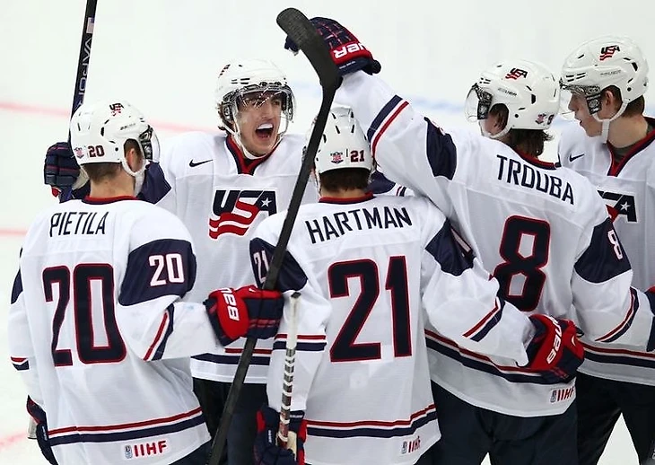 Семь лет назад американские студенты выбросили подопечных Зинэтулы Билялетдинова со взрослого чемпионата мира в Швеции и Финляндии, а перед этим их более молодые товарищи уничтожили канадцев в полуфинале МЧМ и оказались на первой ступени пьедестала почёта несмотря на два поражения на групповом этапе. Перед стартом турнира в России амбициозная дружина Фила Хаусли рассчитывала в первую очередь на своего непробиваемого вратаря Джона Гибсона, одарённого атакующего защитника Джейкоба Трубу и первого американского форварда, вошедшего в тройку лучших проспектов драфта, после Кэйна и ван Римсдайка Алекса Гальченюка, и все они оправдали высокие ожидания, попав в число самых ярких хоккеистов команды.