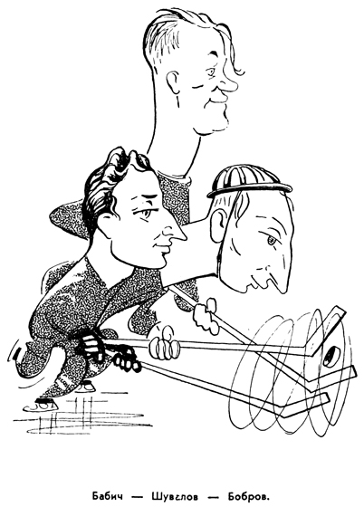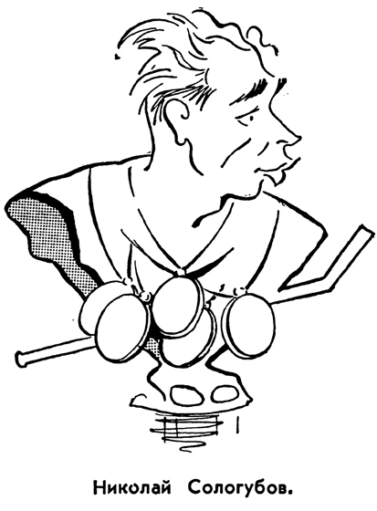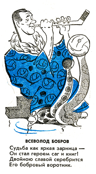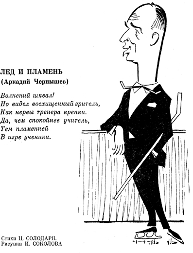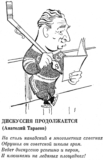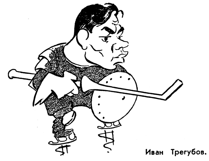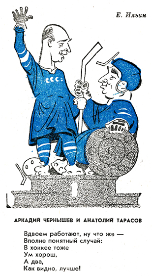 Особенно это касалось того времени, когда хоккей в стране был ещё молодым. Да-да, хоккеистам тоже не удавалось уйти от вездесущего шаржа. Олимпиада в Кортина-д-Ампеццо, 1956 год. Первое золото СССР. Творцы успеха - Анатолий Тарасов и Аркадий Чернышев.