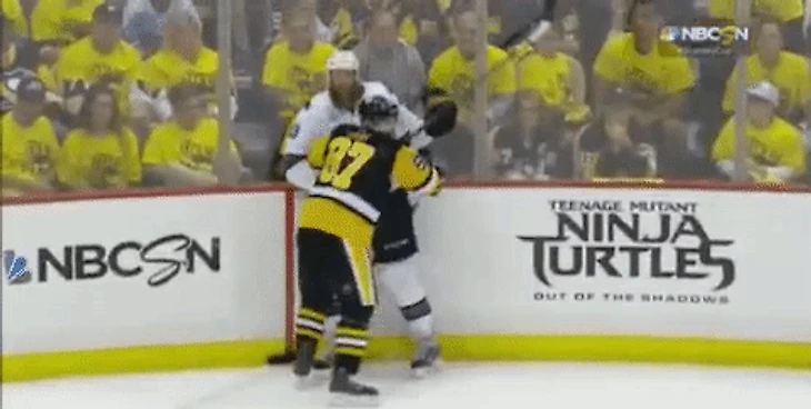 Это финал Кубка Стэнли-2016. Джо Торнтон бьёт Кросби. Капитан "Питтсбурга" даже глазом не повёл и не попытался ответить - всё доказал в игре.