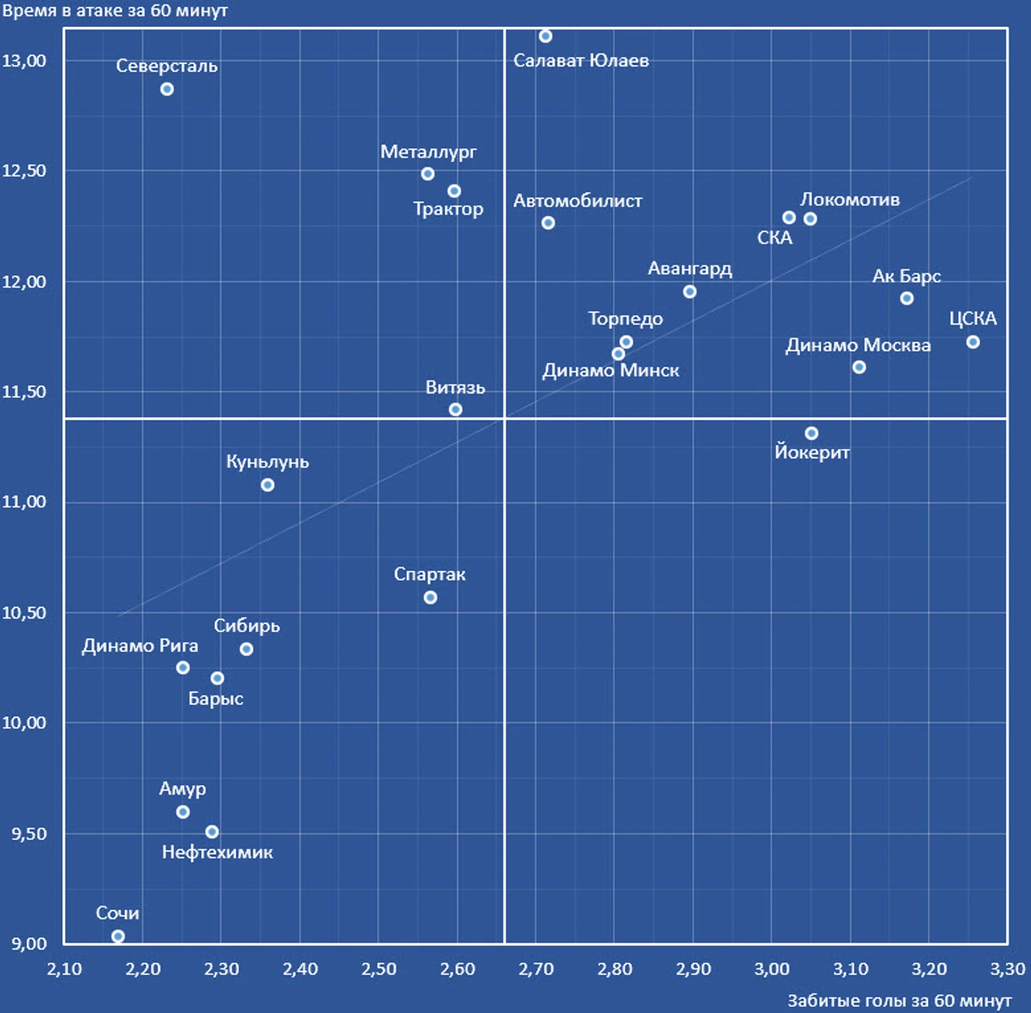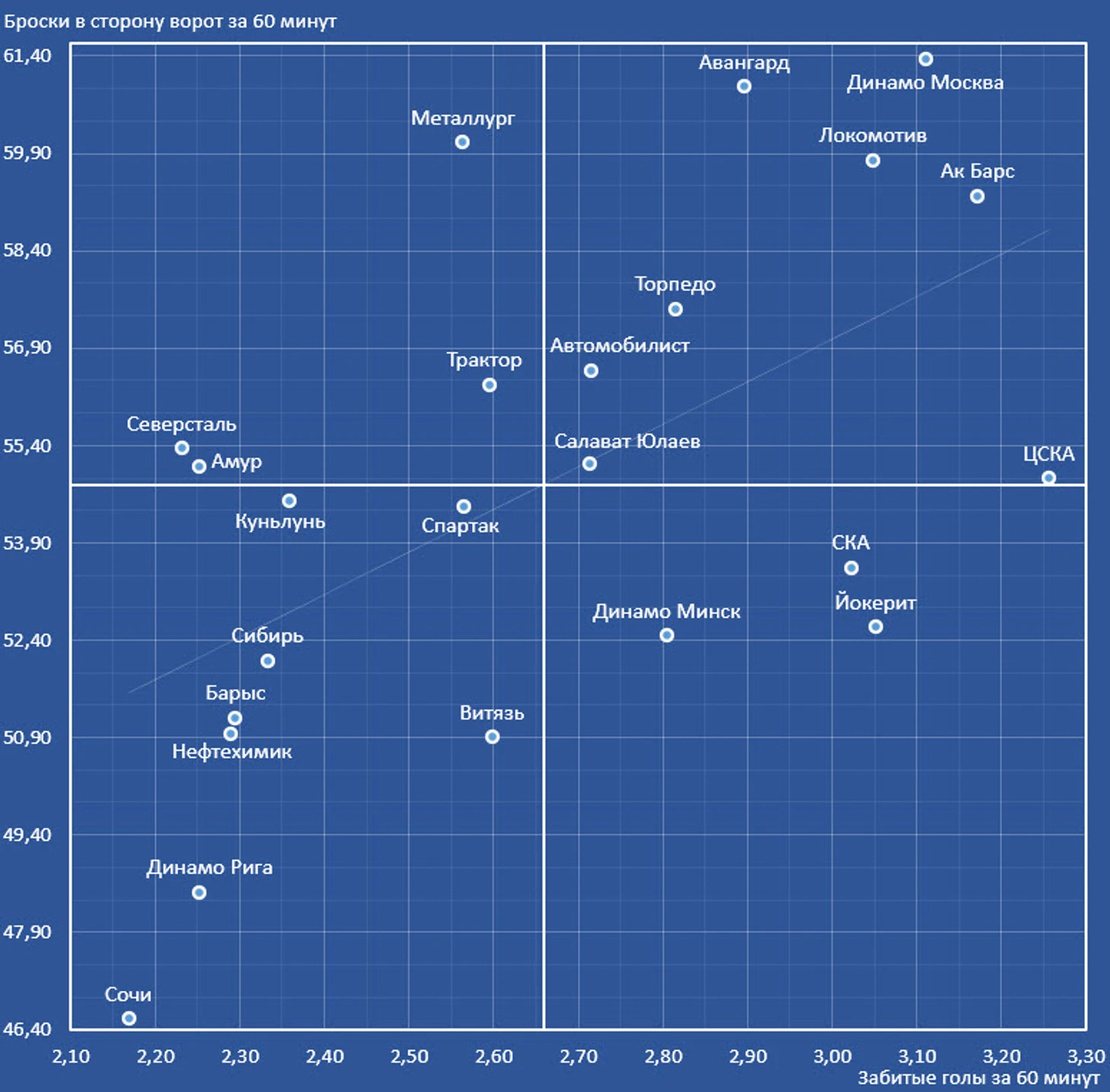 За основу возьмем статистику команд КХЛ, в которой все параметры рассчитываются за 60 минут игры. Осевыми линиями примем средние значения по лиге.