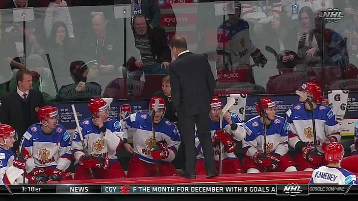 Когда пропускаешь такую первую шайбу от канадцев, то тут сразу возникают вопросы к действиям игроков. Почему после того как Бычков потерял шайбу из вида и затем увидел, как она оказалась у канадца, не бросился в падении мешать броску? Даже если не успеваешь, но может быть добивание(!!!), и ты должен быть первым, кто придёт на помощь. Кстати, то же самое относится и к Бардакову, но у него хотя бы частично действие оказалось за спиной.
