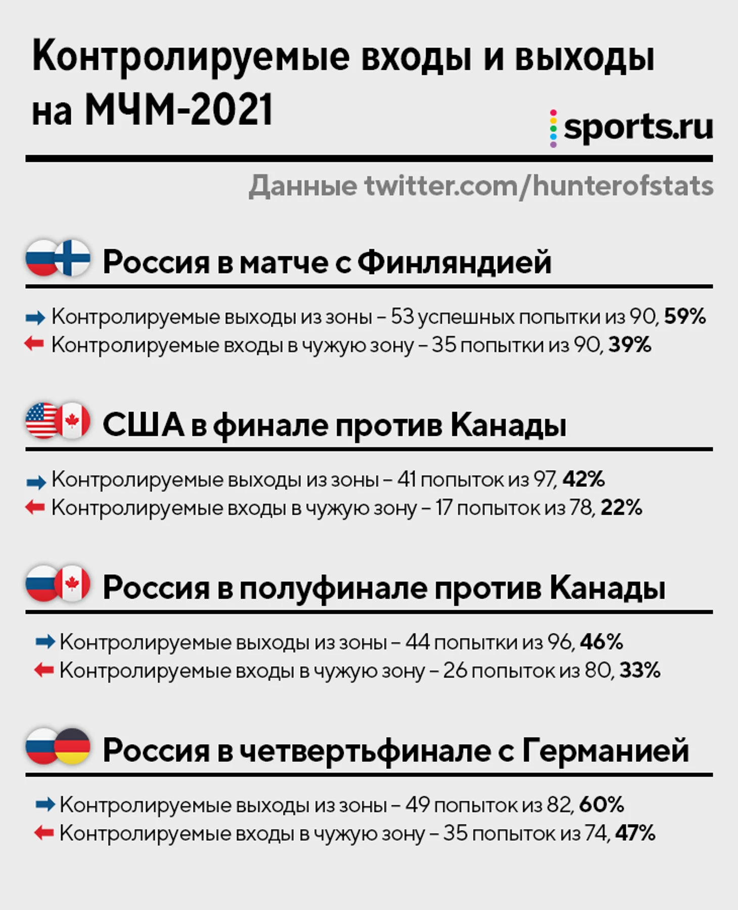 Наши топовые соперники изучали эту манеру сборной и со временем применили кое-какие меры – отдавать длинный пас часто было некуда, потому что противник быстро складывался в средней зоне, и короткий пас в своей зоне никого не обманывал, потому что там не было чужих нападающих. Но средняя статистика по 7 матчам в Эдмонтоне (без учета игры с Австрией, но включая товарняк с Канадой) говорит о том, что контролировать выходы из зоны у нас получалось.