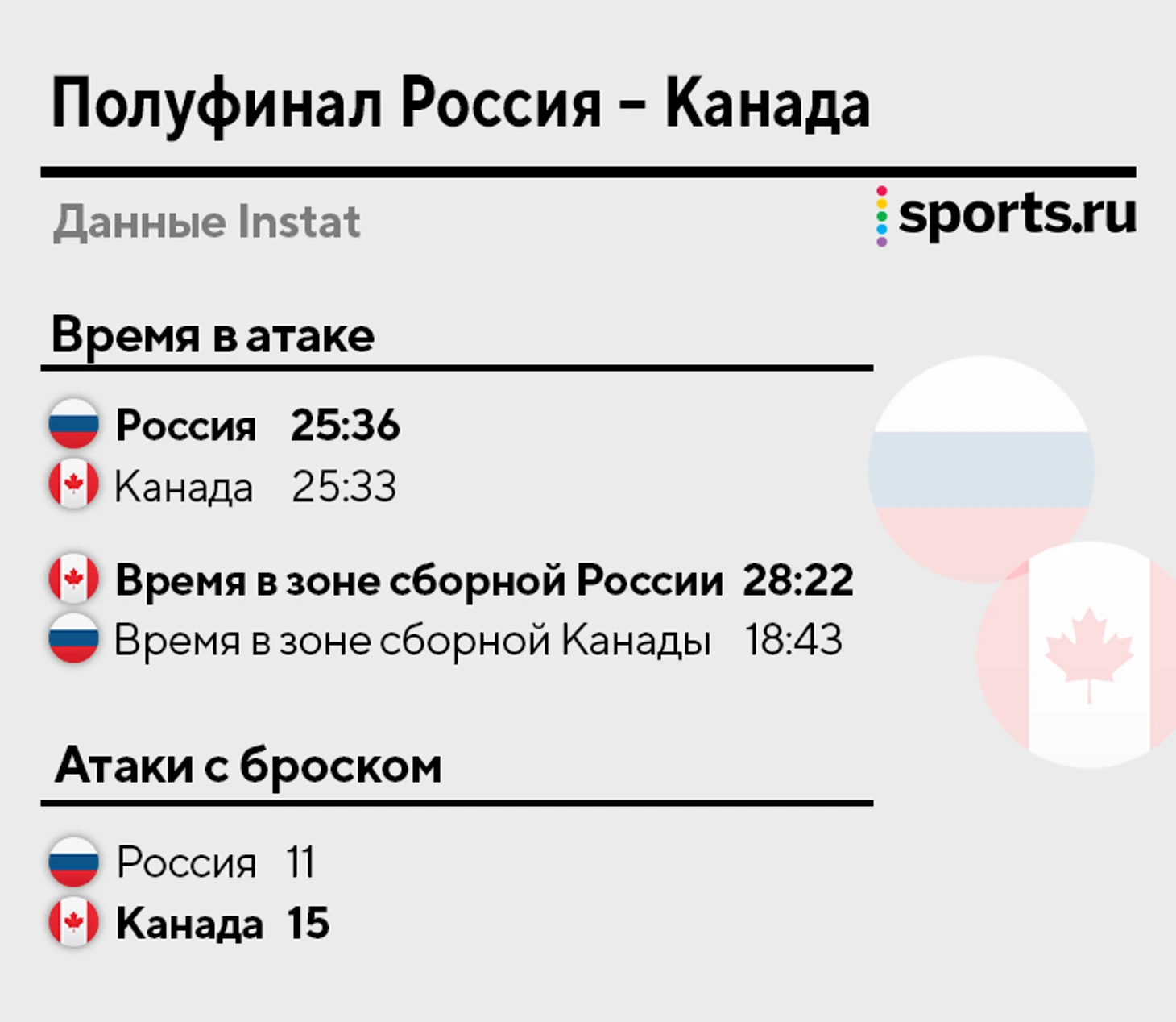 Это было и в товарищеской игре против Канады, и в группе против Швеции. Желание чисто начинать атаку привело к интересным статистическим последствиям. Взять, например, полуфинал: общее время в атаке (то, что команда играла с шайбой) практически равное, 25:36 – 25:22 в нашу пользу (эти цифры я взял у Instat).