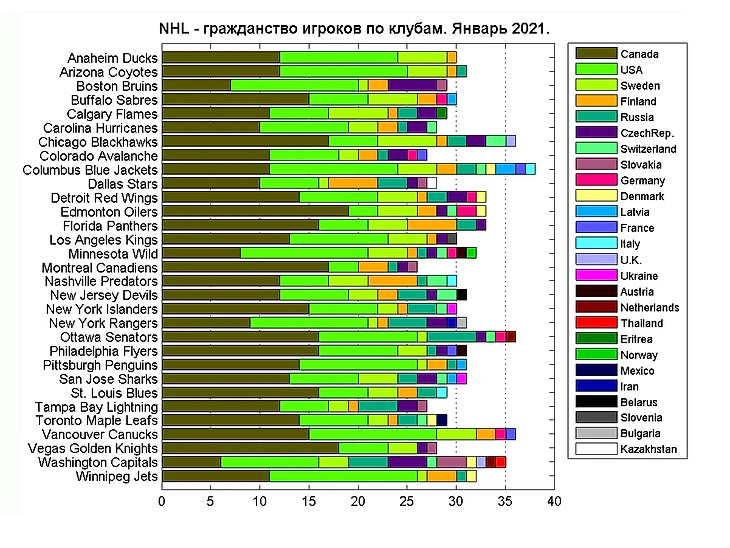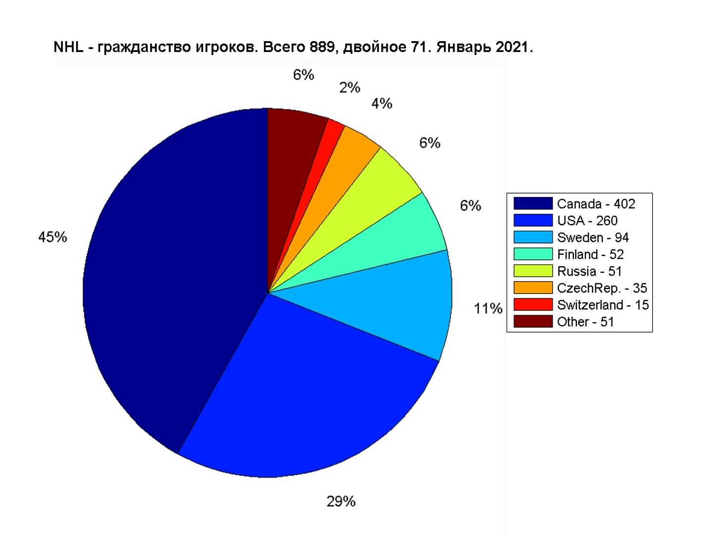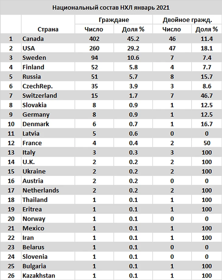 Национальное распределение игроков НХЛ 2021. 51 игрок с российским гражданством, у 8 из них оно двойное