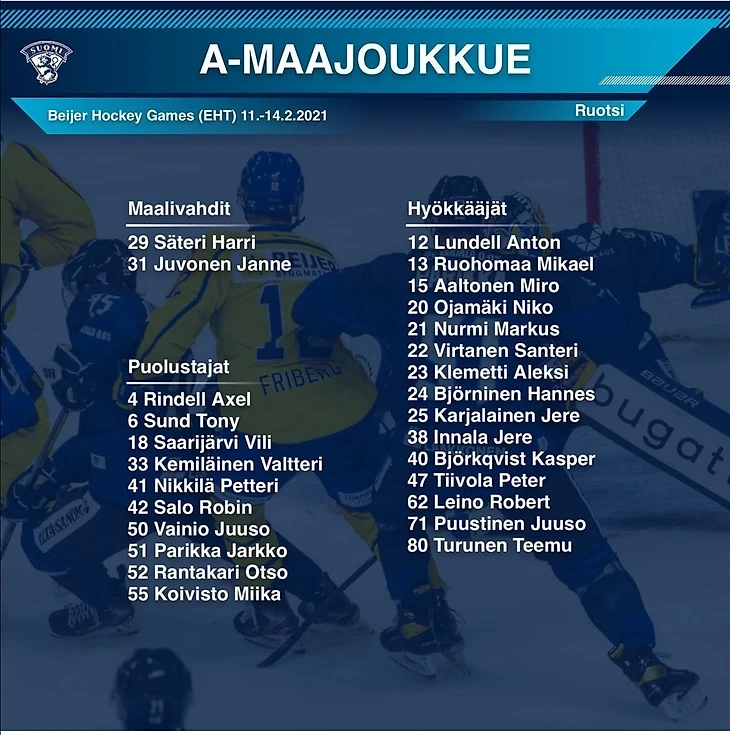 Официальный аккаунт сборной Финляндии по хоккею опубликовал список игроков, заявленных к участию в третьем этапе Евротура. Турнир пройдет в Швеции с 11 по 14 февраля в Мальмё. Игры пройдут в формате "пузыря" для обеспечения безопасности хоккеистов, тренерского штаба и персонала в связи с пандемией коронавируса.