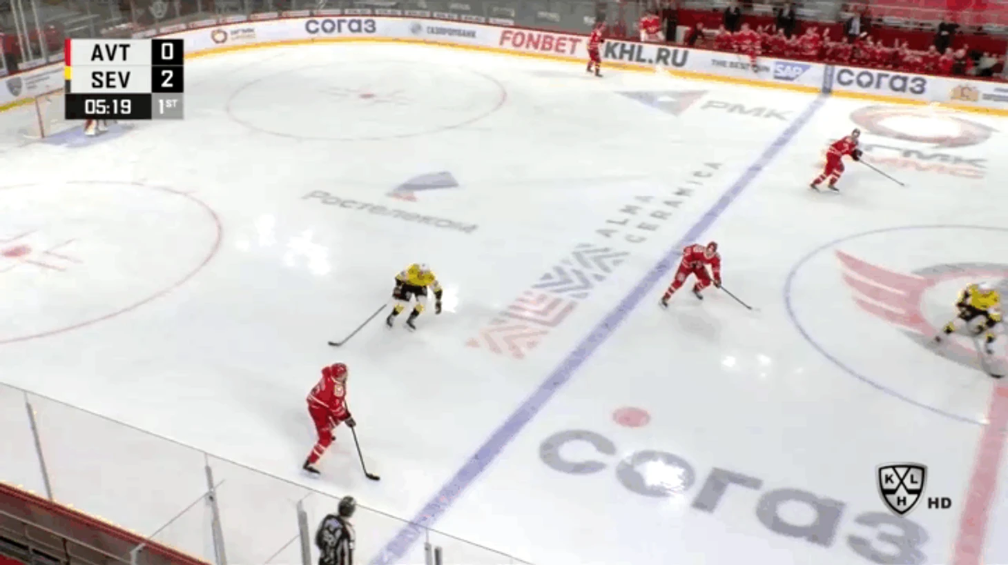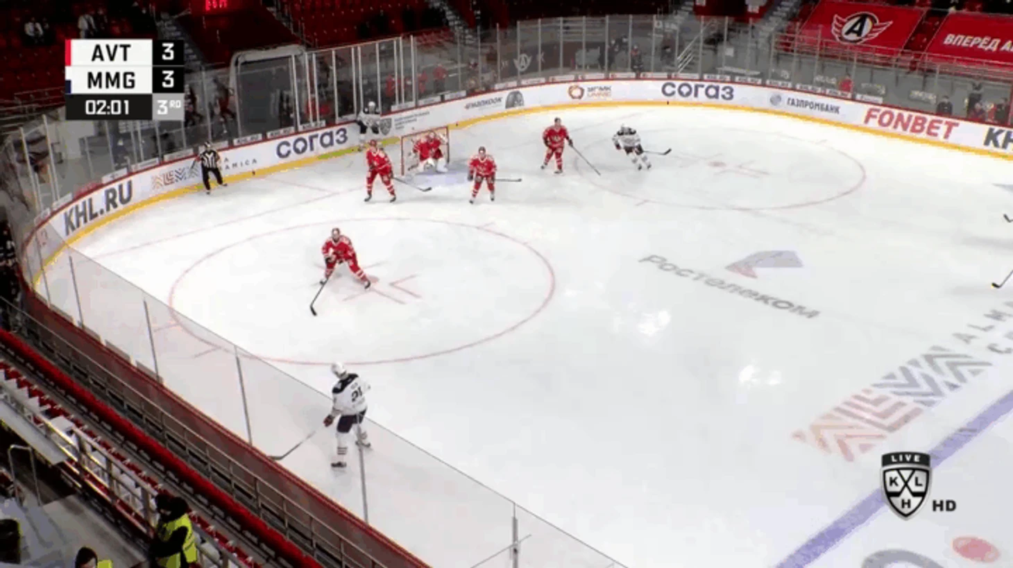 Здесь «Ак Барс» выбросил шайбу из своей зоны. Первым на ней был Мамкин, который ничего не смог сделать и завязалась борьба. Трямкин зачем-то приехал вторым за ворота. Мамкин откинул шайбу в угол, но потерял клюшку. Мэйсек этого не ожидал, ему пришлось разворачиваться, из-за чего он не успел к этой шайбе. Пас на пятак и Доус один, ведь оба защитника все еще оставались за линией ворот.
