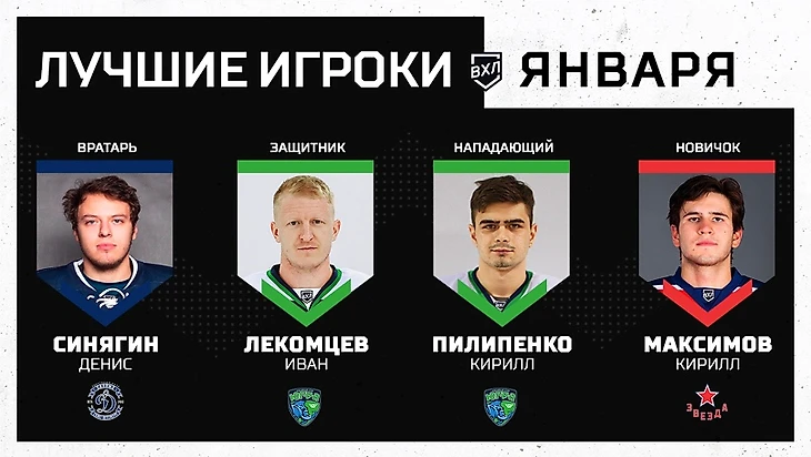- лучшим вратарем признан Денис Синягин (1994) из «Динамо СПб», который провел в январе семь матчей, одержав шесть побед, четыре из которых «сухие». Егор отразил 97,92 % бросков в створ ворот при коэффициенте надежности 0,57.