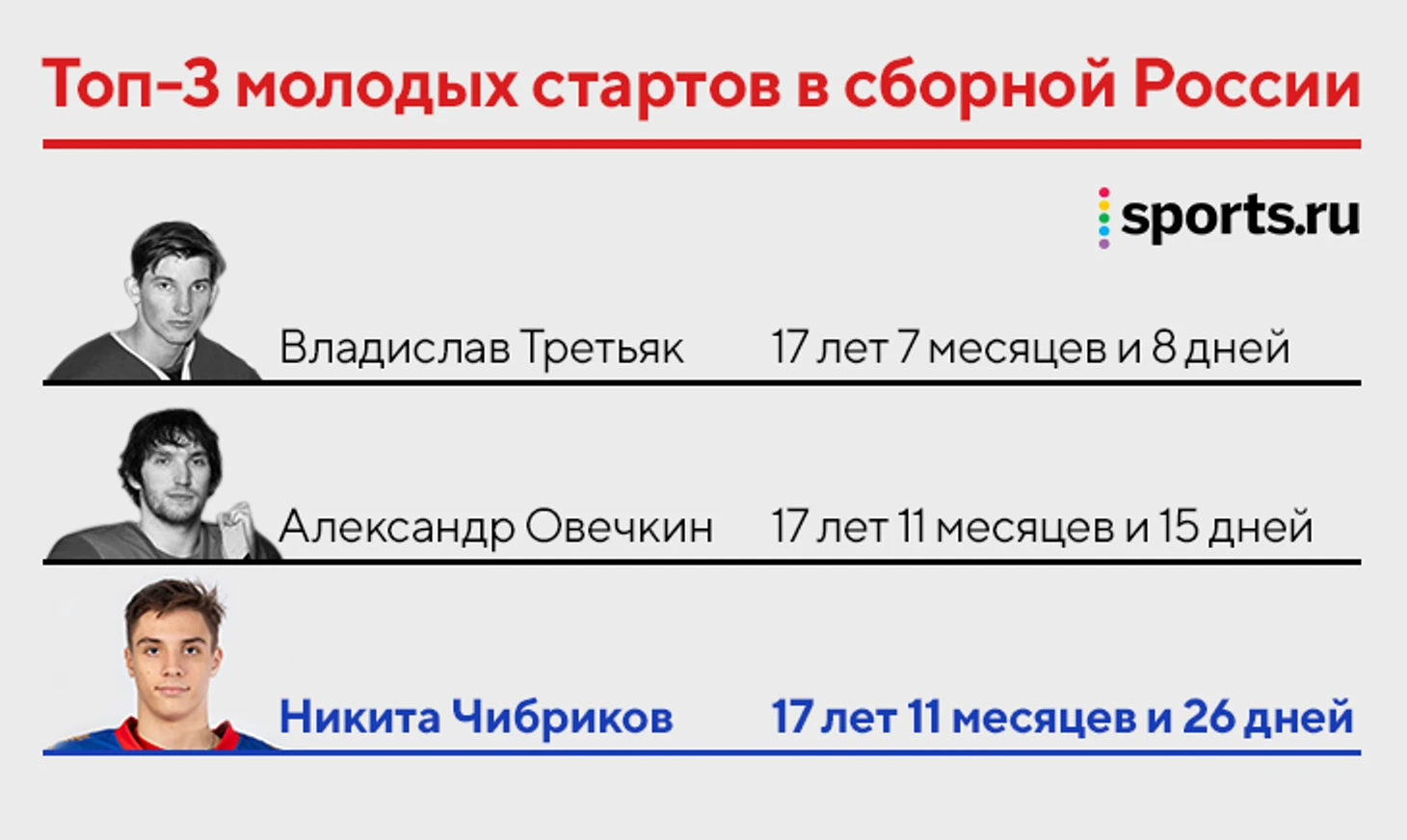 Самый молодой старт в истории сборной – у Владислава Третьяка. Второй человек в этом списке – Александр Овечкин. Третьим стал нападающий Никита Чибриков: в момент матча с Финляндией ему было 17 лет 11 месяцев и 26 дней.