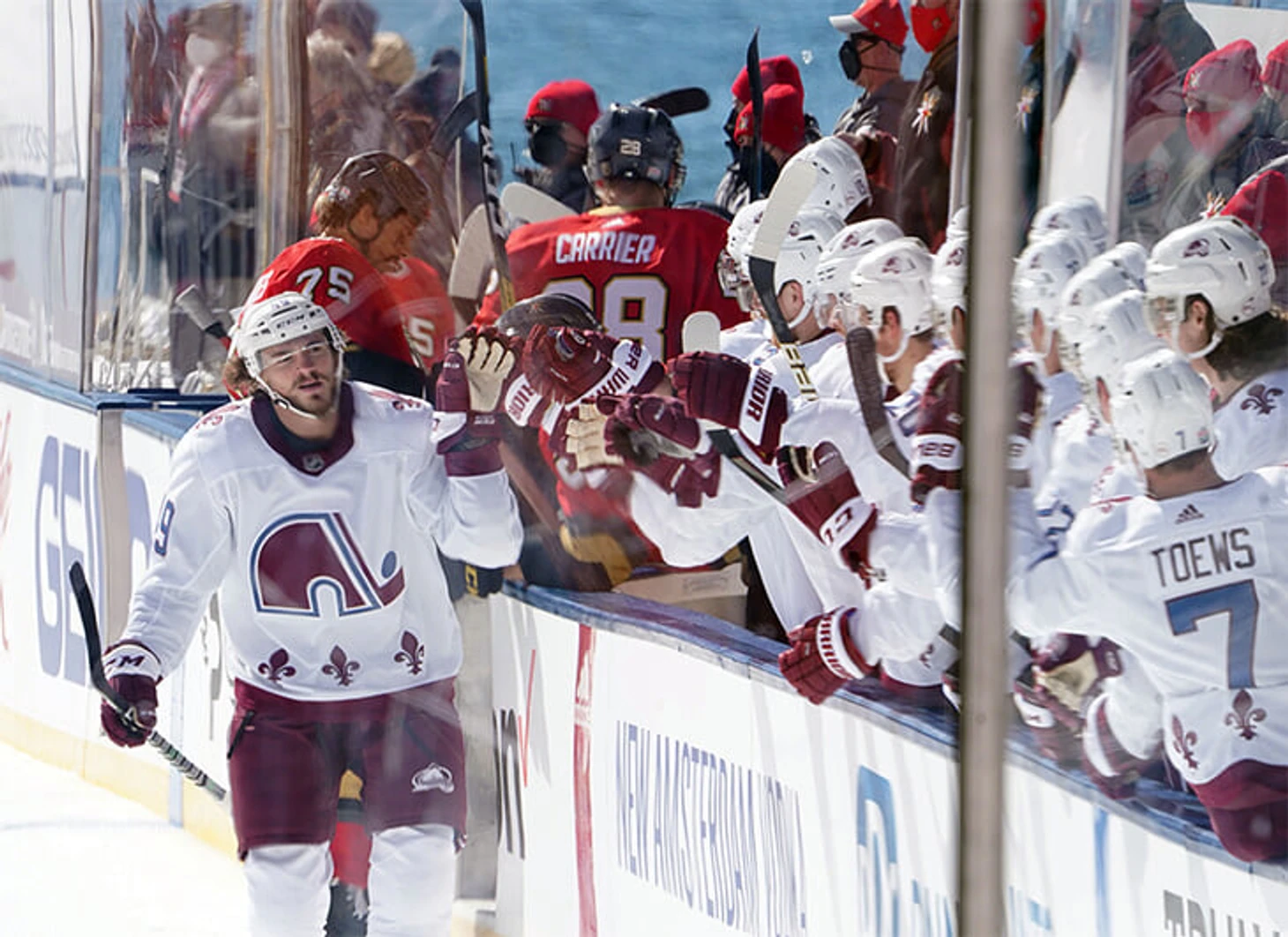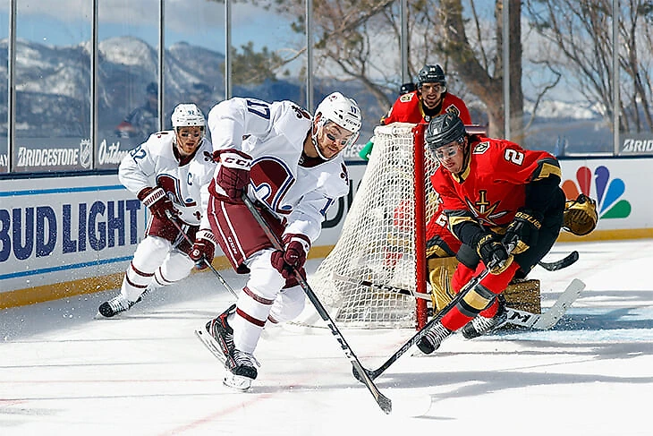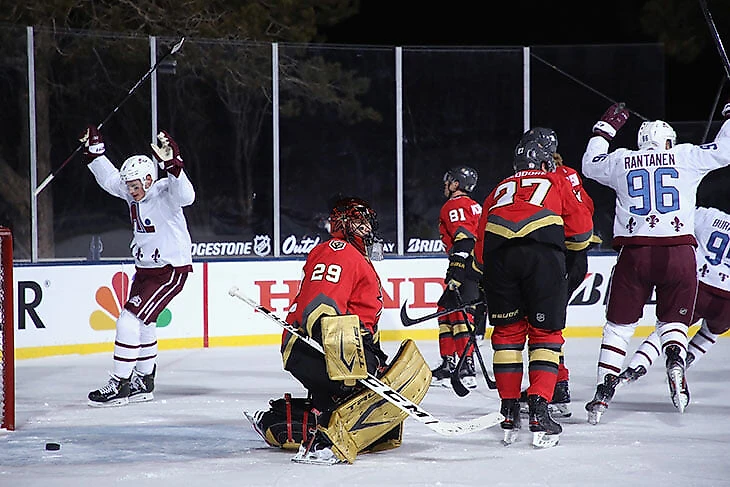 Специальному матчу – специальную форму: «Колорадо» вышел в джерси «Квебека» (если помните, команда переехала в 1995-м и выиграла Кубок Стэнли в первый же год на новом месте), замиксованном с фирменным тоном «Лавин». Ретро «Вегаса» уже звучит смешно (клуб играет с 2017 года), поэтому «рыцари» вышли фактически в альтернативном джерси.
