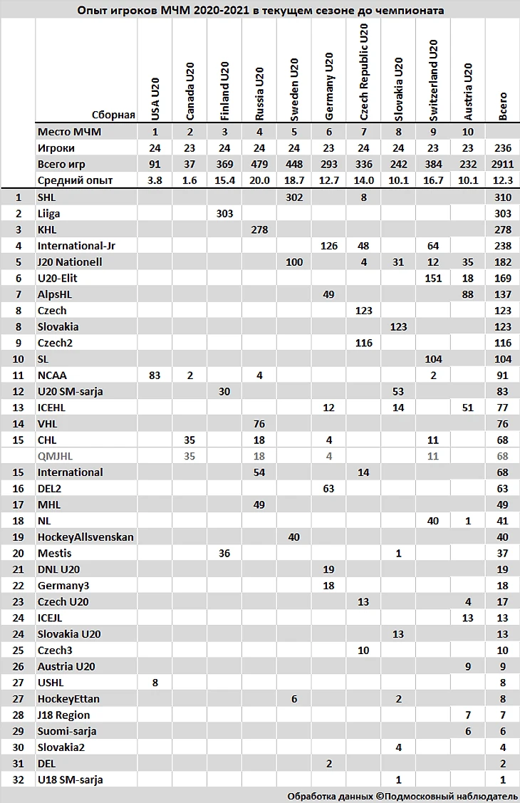 Наибольший суммарный опыт к МЧМ набрали игроки сборной России. Сумма их игр составляла 479 матчей, из которых 278 они провели в КХЛ, 76 в ВХЛ, 54 в международных турнирах, включая Евротур, 49 в МХЛ и 18 в CHL.