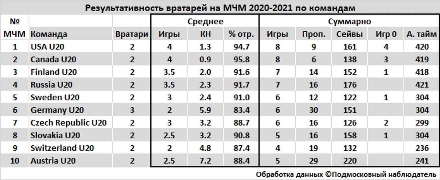 А наилучшую вратарскую надежность обеспечили представители NCAA - 95.1% отраженных бросков и коэффициент надежности 1.1.