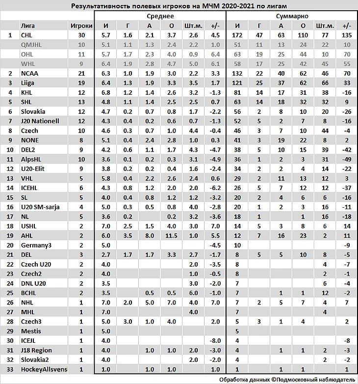 Рассматривая результативность полевых игроков, если брать лиги имевшие 9 и более игроков, то наибольших успехов на МЧМ добились представители CHL в среднем на их счету 3.7 очков на игрока и показатель полезности 4.5, вторые бомбардиры МЧМ представители Liiga со средними 3.3 очками на игрока полезностью 1.7, третьи по результативности представители NCAA - средние 3 очка на игрока и вторая средняя полезность 3.3. Средняя результативность представителей КХЛ 2.6 очков на игрока и отрицательная средняя полезность -1.3.