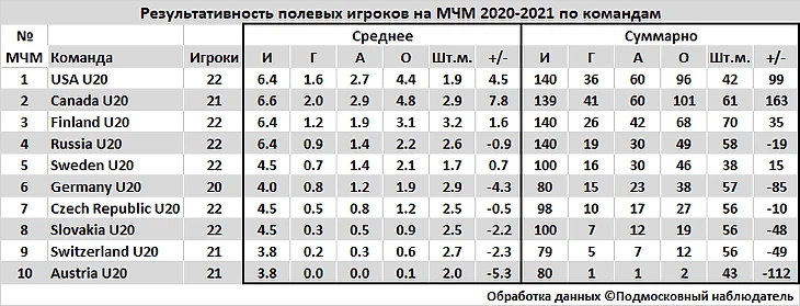 Основываясь на данных портала www.eliteprospects.com посчитаем некоторую статистику по итогам МЧМ 2021.