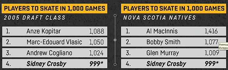 Помимо этого Сидни Кросби стал 4 уроженцем Новой Шотландии, кто добрался до 1000 матчей в Лиге. До него это удалось сделать Элу Макиннису (1416 матчей), Бобби Смиту (1077 матчей) и Глену Мюррею (1009 матчей). Уже по ходу этого сезона Кросби войдет в тройку, по ходу следующего года, скорее всего, догонит Смита, а уж доберется ли до Макинниса - вопрос. На это потребуется ещё как минимум 4,5-5 полных сезонов.