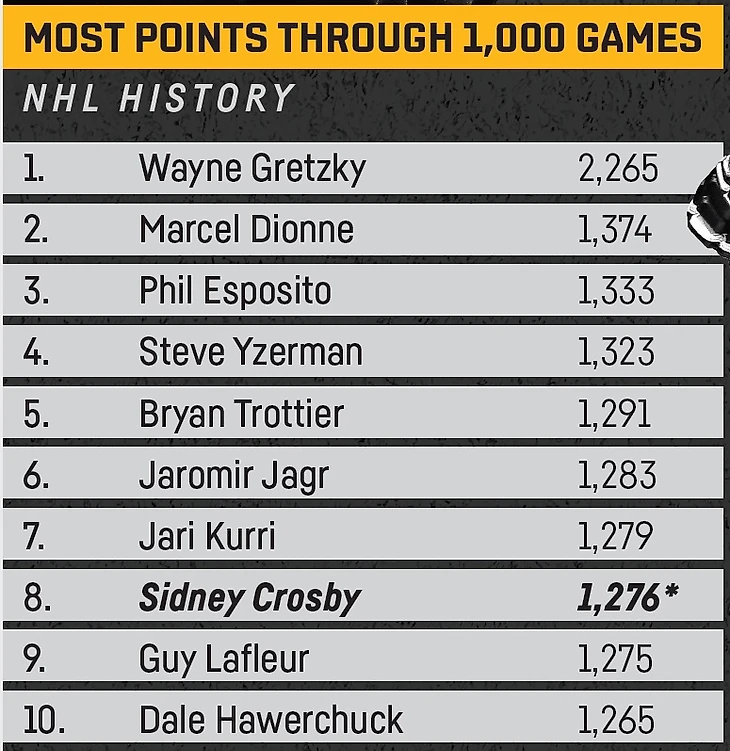 За 1000 матчей в Лиге Сид набрал 1278 очков. Это восьмой показатель в истории НХЛ. На первом месте, разумеется, Уэйн Гретцки с 2265 баллами, у Марселя Дионна 1374 очка, у Фила Эспозито 1333 балла. Если бы Кросби выдал потрясающий перфоманс в своей юбилейной игре и набрал 4+ очков, то мог бы подвинуть с 7 строчки Яри Курри - у финна 1279 очков.