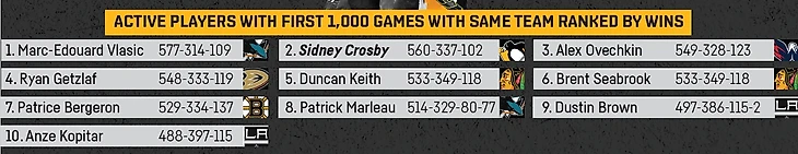 Тысяча матчей за карьеру - достижение хоть и значимое, но не такое уж и редкое. Всего в истории Лиги до этой отметки добирались аж 350 хоккеистов. Конечно, подавляющее большинство из них - яркие представители 20 века, когда игровой век хоккеистов был более долгим. На данный момент в НХЛ выступает целых 25 человек, преодолевших этот значимый рубеж. Однако куда более солидно сыграть 1000 матчей за один клуб. Таких в истории Лиги было уже намного меньше - 57 человек, а действующих игроков с такой цифрой всего лишь 10, включая самого Кросби. Помимо него это также дуэт из "Сан-Хосе" в лице Патрика Марло и Марка-Эдуарда Влашика, Данкан Кит и Брент Сибрук из "Чикаго", Дастин Браун и Анже Копитар из "Лос-Анджелеса", Патриc Бержерон из "Бостона", Александр Овечкин из "Вашингтона" и Райан Гетцлаф из "Анахайма".