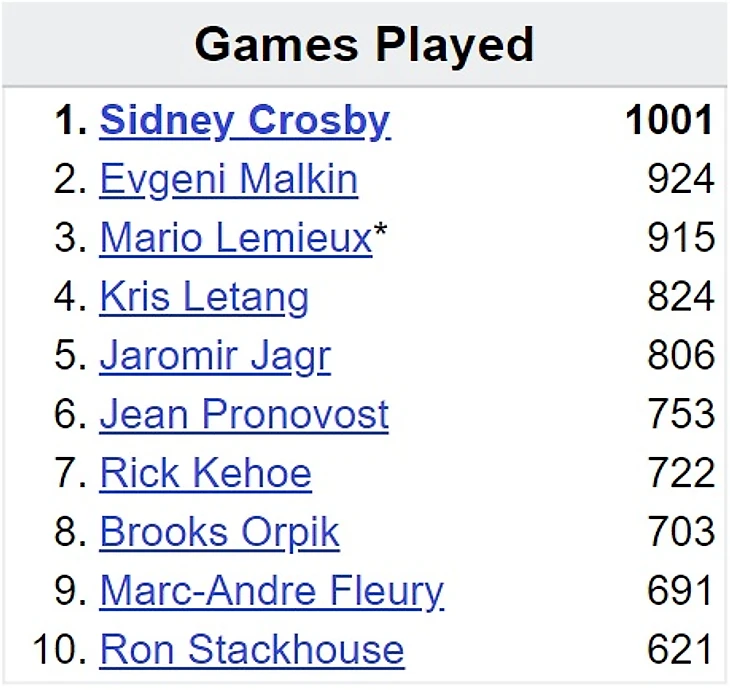 Кросби - 10 игрок в истории, сыгравший 1000 матчей за один клуб