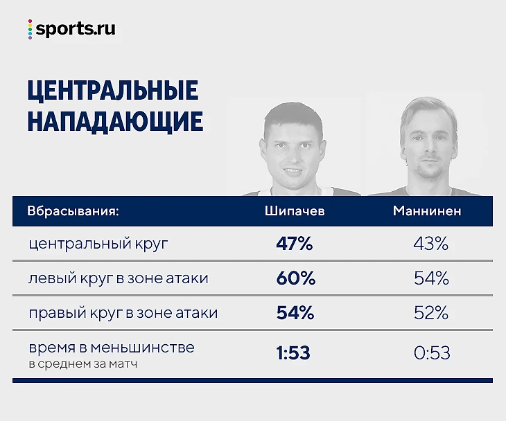 Плюс – есть технические детали. Вадим чуть-чуть получше на точке: на вбрасываниях в своей зоне они с Манниненом действуют с похожей эффективностью, в средней и чужой у Шипачева на 4-5% больше. Кроме того, Вадим раскрылся как универсал – в каждой игре он проводит в среднем почти по две минуты в меньшинстве, у Сакари – 0:53.