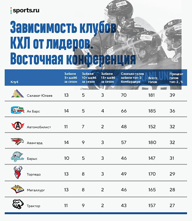 Плей-офф КХЛ вот-вот начнется, так что самое время оценивать команды. Мы решили посмотреть на зависимость клубов от лидеров, взяв за основу самый простой показатель – голы. Никакой сложной аналитики – просто несколько очевидных цифр, которые помогут понять, как команды планируют забивать в плей-офф.
