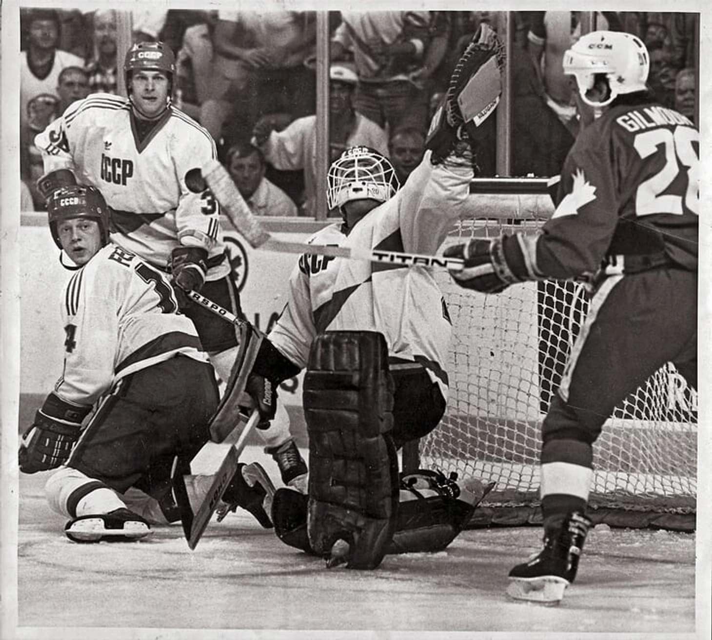 Сентябрь 1987 года. Кубок Канады. Анатолий Семенов и Анатолий Федотов у ворот Евгения Белошейкина. Справа — нападающий сборной Канады Дуг Гилмор.