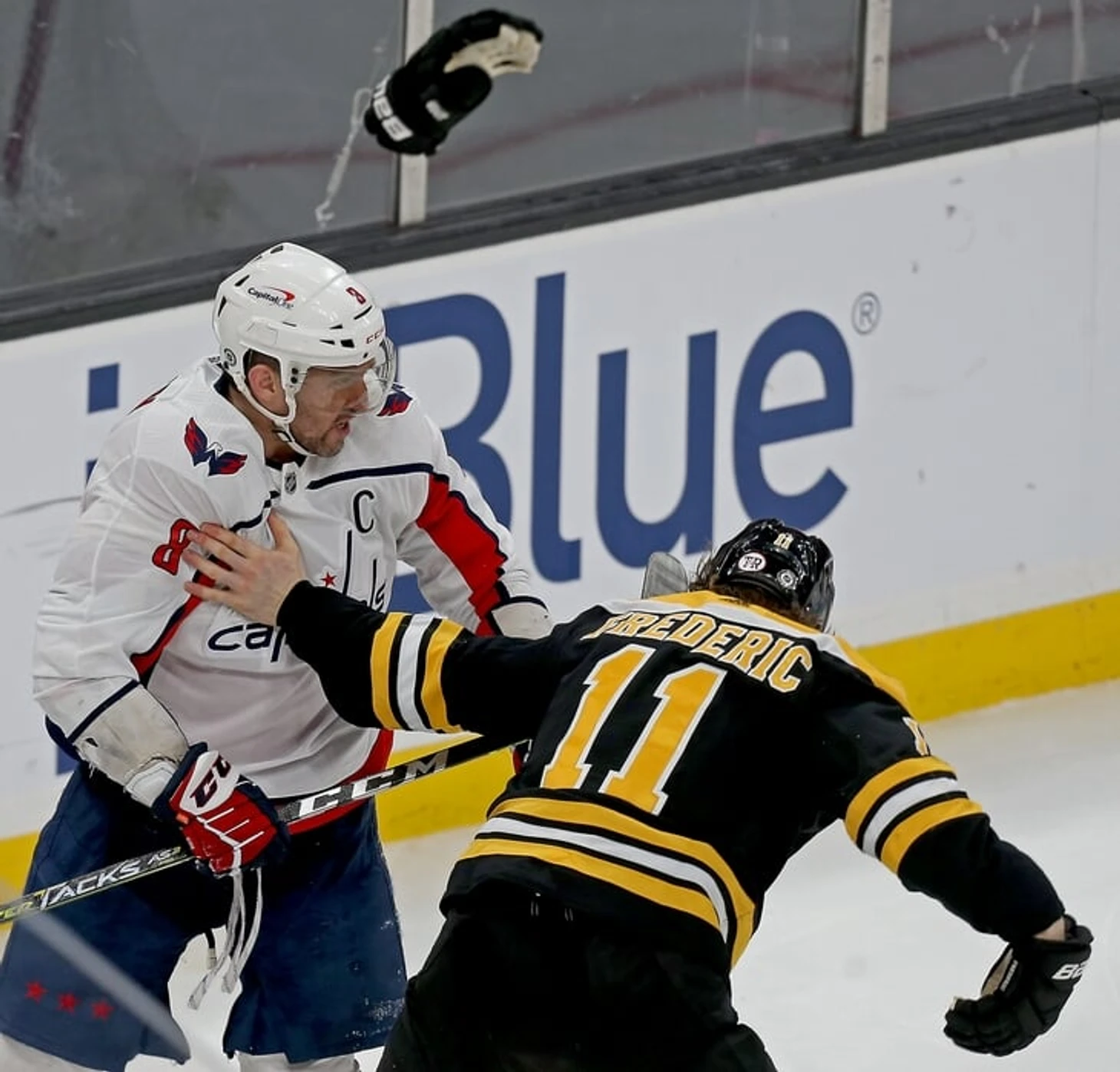 Был и еще один микросюжет: Трент Фредерик, молодой нападающий «Брюинс» несколько раз пытался спровоцировать Овечкина. В формате 5 на 5 Фредерик провел на льду 12 минут – 4 из них он отыграл непосредственно против Овечкина. В итоге все закончилось самой смешной дракой в карьере Александра – сначала Фредерик отправил Овечкина в борт, тот недобро посмотрел на американца, который скинул перчатки, но ответной реакции не получил.