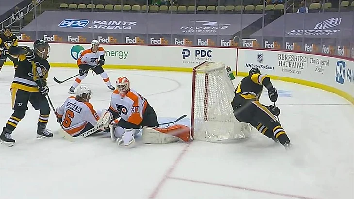 Шикарный скрин момента, из которого кажется, что голкипер «Флайерс» Брайан Эллиотт даже не понимает, куда поехал соперник – хотя на самом деле он наверняка догадывался, что ворота обречены.