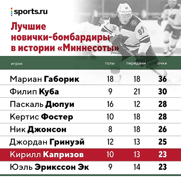 Кирилл продолжает уверенно идти за «Колдером»: в 25 матчах дебютного сезона у него уже 23 (10+13) очка – лучший результат среди новичков. Капризов стал седьмым новичком клуба, забившим 10 голов за сезон, а его 23 очка – 8-й результат в истории «Миннесоты». Лидер тут пока Мариан Габорик с 36 (18+18) очками. И, кажется, уже никто не удивится, если Капризов обойдет и его.
