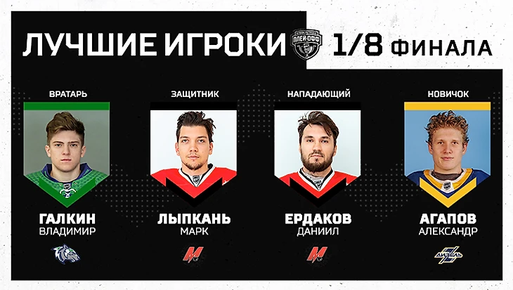 - лучшим вратарем признан Владимир Галкин (2000) из «Горняка», который провел в 1/8 финала четыре матча, одержав четыре победы, три из которых «сухие». Владимир отразил 99,2 % бросков в створ ворот при коэффициенте надежности 0,25.
