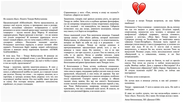 Все вы знаете, что сегодня стряслось с Тимуром Файзутдиновым. Искренне соболезную близким и родным 19-летнего парня. По этому поводу меня тронул текст девушки из пресс-службы "Динамо СПб". Вот, прочитайте (открыть в новой вкладке, чтобы было разборчивее):