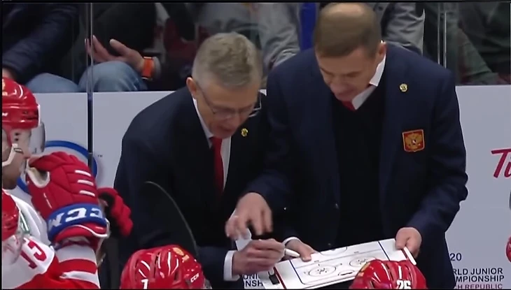 И здесь возникает достаточно тяжелое ощущение дежавю – вот флэшбэк из декабря 2019 года. Заканчивается основное время матча Россия – Чехия на МЧМ-2020, наша сборная берет таймаут – и планшет с маркером в руках Игоря Ларионова. Брагин пытается перехватить фломастер, но безуспешно.