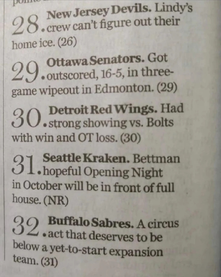 Далеко уходить не придётся - в том же дивизионе пробивает дно "Баффало". В этом сезоне у "клинков" всё настолько грустно, что даже шутить уже не хочется. Лучшая, на мой взгляд, шутка выглядела вот так (взято с просторов североамериканских твиттерианцев):