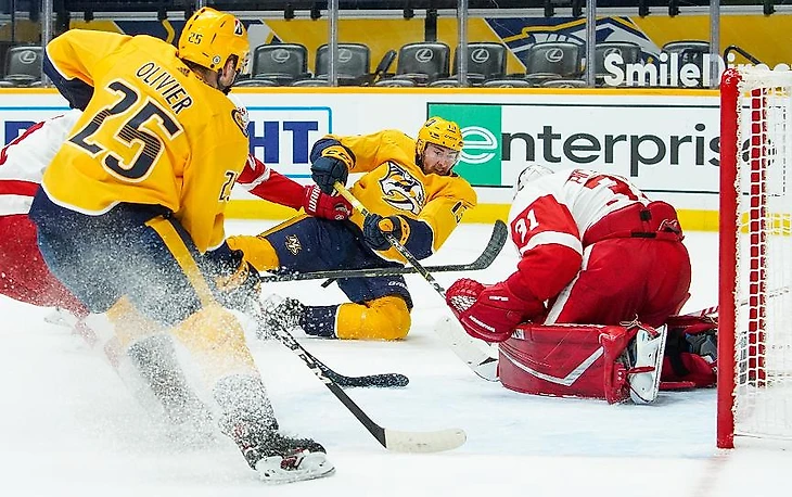 "Нэшвилл Предаторз"-"Детройт Ред Уингз" 7:1.Рокко Гримальди забросил 4 шайбы,Эрик Хаула и Роман Йоси отдали по 2 результативные передачи,Юсе Сарос отразил 20 бросков."Хищники" выиграли 3 игру подряд.