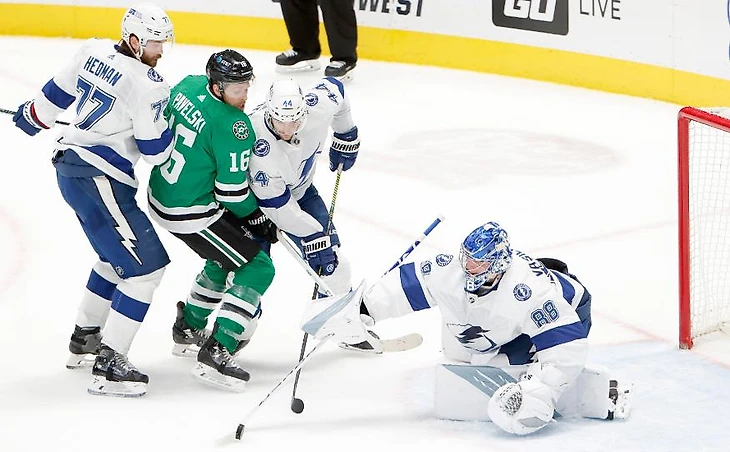 "Даллас Старз"-"Тампа-Бэй Лайтнинг" 4:3.Руи Хинтц за минуту до конца матча забросил победную шайбу.Джо Павелски и Руп Хинтц набрали по 3 очка (1+2),Джейсон Робертсон набрал 2 очка (1+1),Джейк Оттингер отразил 24 броска.У гостей Ондржей Палат и Янни Гурд набрали по 2 очка (1+1),Михаил Сергачёв отдал результативную передачу.Во втором периоде Джейми Олексиак подрался с Люком Шенном.
