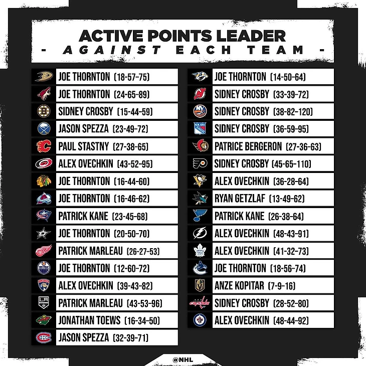 Официальный твиттер НХЛ подогнал еще годной статистики и интересной инфографики. На этот раз они задались вопросом: Кто из активных игроков был грозой каждой из команд НХЛ? Другими словами, кто набрал больше всего очков за карьеру против каждой из команд?