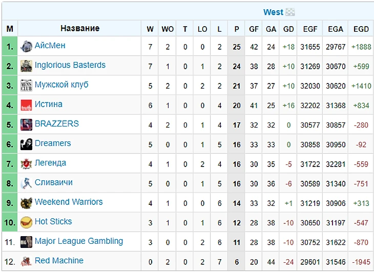 Победителями Западной конференции стала команда АйсМен. 4 чистые победы на этапе, 25 очков - очень хороший результат. Опытная команда с 3 игроками в топ-60. Лишь на очко отстали Inglorious Basterds. Именитая команда, наравне с АйсМен и еще двумя командами Запада - Мужским Клубом и Истиной, будут претендовать на победу в регулярке. Лидер Мужского Клуба (почти мужского) Кристина Усенко - лидер ОЗ! В шестерке еще один игрок - kriv04.