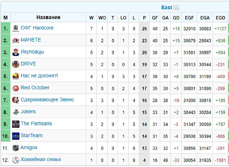 Победителями Восточной конференции стала команда ОФГ Hardcore. Прекрасно проведшая 2й этап (4 чистые победы, 15 очков) команда заслуженно становится победителем Востока и имеет очень хорошие шансы на победу в регулярке. Лидер команды - GRAF88, занимающий 2 местов ОЗ.