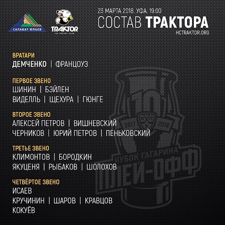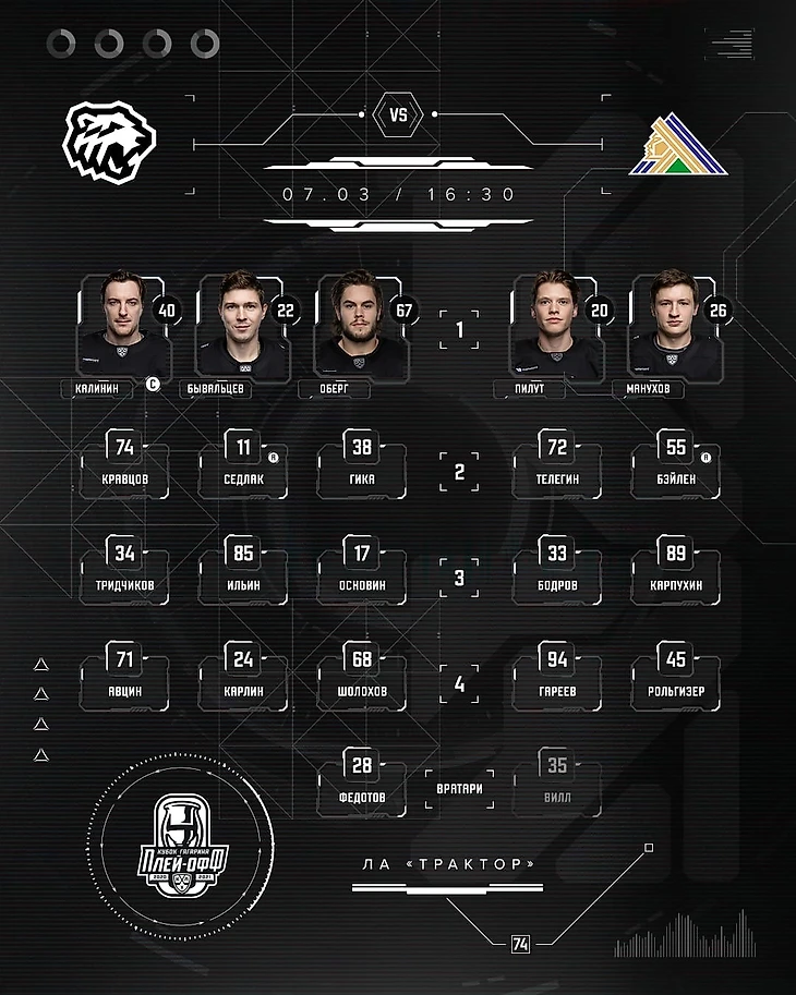 Трактор подходил к плей-офф почти в идеальном составе, отсутствовал только Ярослав Косов. Но уже сразу на первую игру в составе команды появились Марсель Шолохов и Александр Тридчиков. Которые весь сезон провели в Челмете и только в конце сезона подключились к Трактору, при этом стоит отметить, что даже в составе Челмета они не были лучшими. Но при этом, они знакомы Гатиятулину, вы можете посмотреть, что Шолохов и Тридчиков выходил в плей-офф. Тридчиков с Барысом, Шолохов в бронзовом. Вот только оба скорее были 13 нападающими и иногда подменяли игроков, но только не в этом сезоне. Оба отбегали все 5 матчей серии без замен.