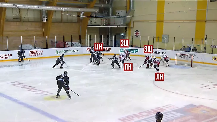 Опаснее всего в атаке в таких ситуациях крайний нападающий, который ждет шайбы на верху круга. В зоне защиты обычно игроков держат вот так: центральный — центрального, защитники — крайних нападающих. Если вбрасывание проигрывается и шайба доходит до главной угрозы — крайнего нападающего — на него должен максимально быстро выдвигаться один из защитников. И они оба должны располагаться в районе пятака, а не как в этом случае, где второй стоит на лицевой линии.
