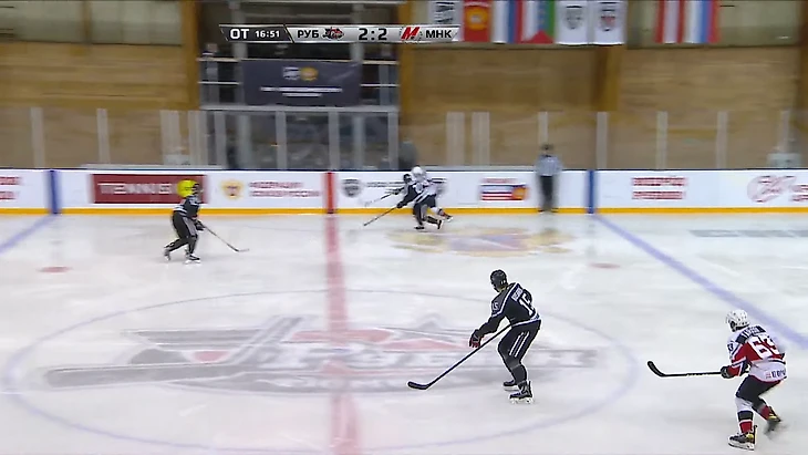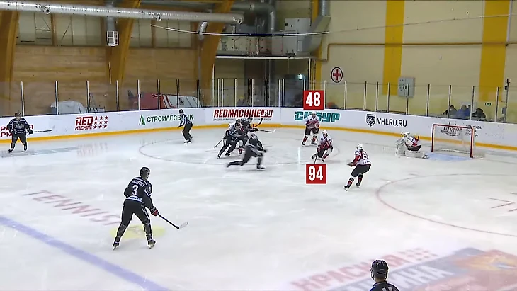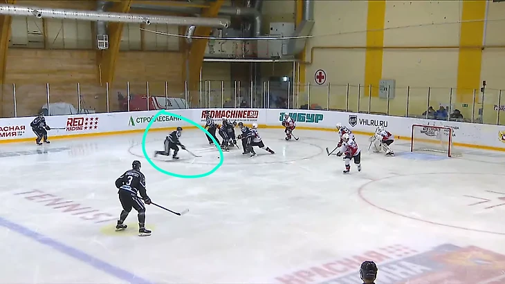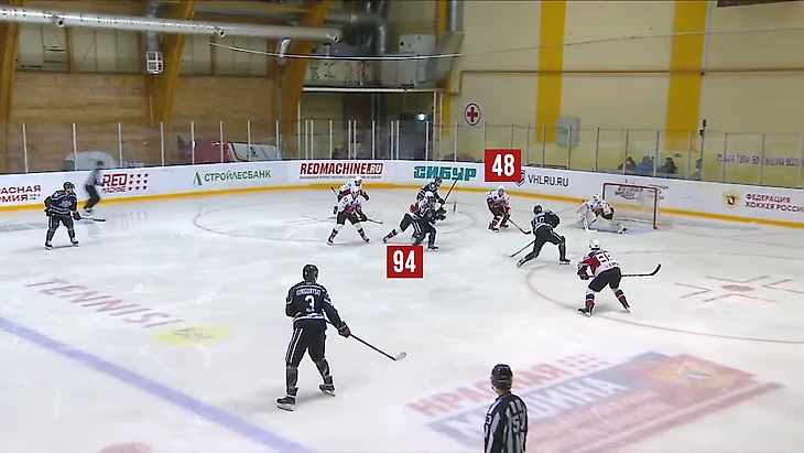 Вбрасывание проигрывается вчистую, шайбу получает крайний «Рубина», который сразу готов бросать. Защитник под 94 номером от него далеко — помешать нет возможности, поэтому остается только блокировать бросок. Второй защитник (48) в эпизоде не участвует из-за своей изначальной ошибочной позиции.