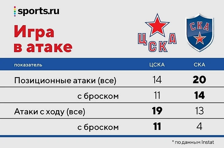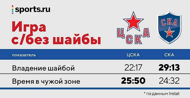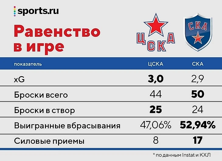 Это я к тому, что СКА сыграл не так плохо, как кажется по счету и исходя из поверхностного впечатления от матча. Самые общие цифры – броски в створ, xG, вбрасывания и силовые приемы – показывают равенство и даже небольшое преимущество СКА.