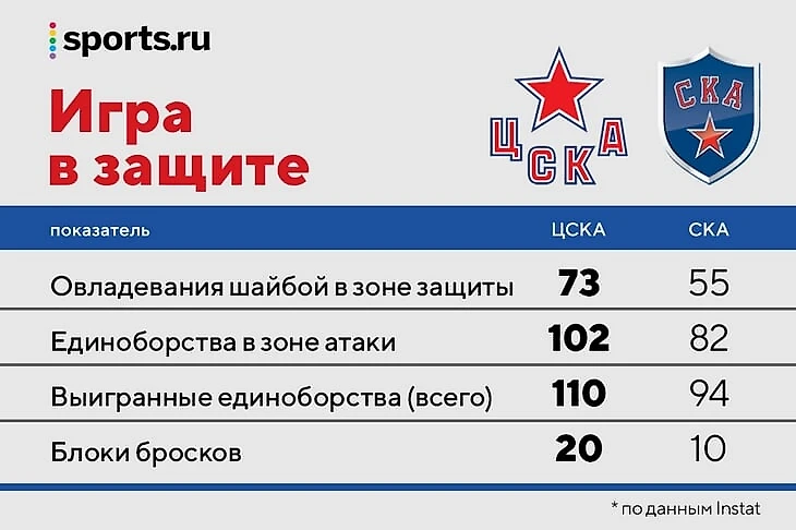 Качество игры ЦСКА без шайбы видно по продвинутой статистике – по количеству овладеваний шайбой в зоне защиты (согласен, кривоватый термин, но придумал не я, и бодрой замены у меня нет, потому что тут и отборы, и подборы сразу), по количеству единоборств, затеянных в чужой зоне и выигранных вообще, и по числу блоков.