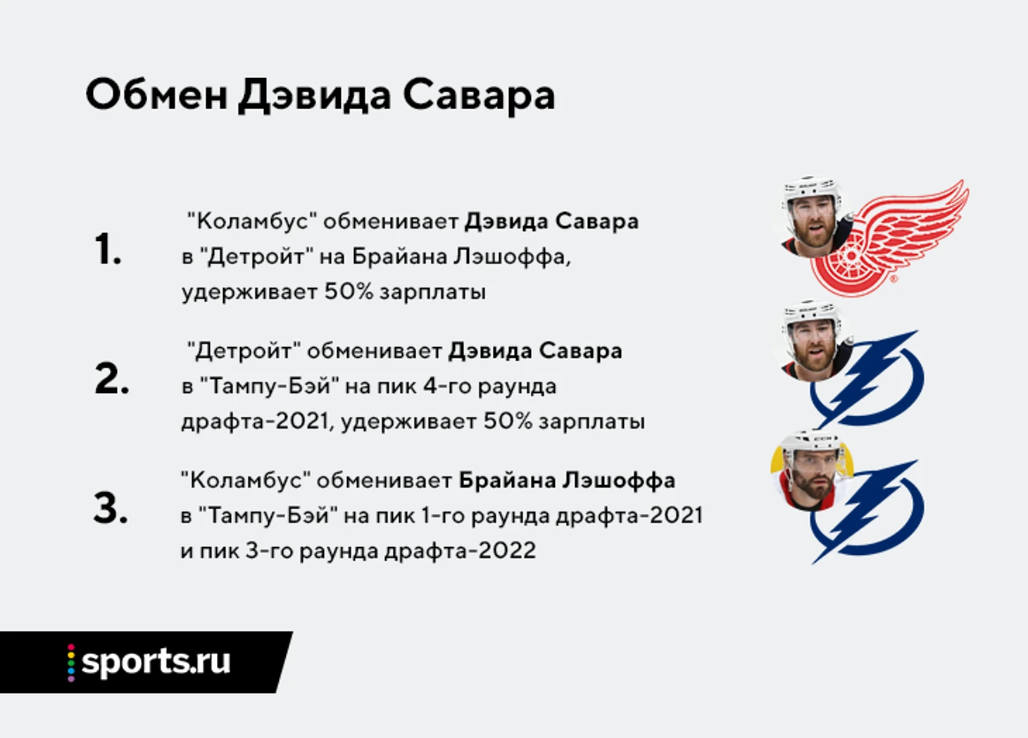 Сначала «Коламбус» отправляет Савара в «Детройт» в обмен на защитника фарм-клуба Брайана Лэшоффа, удерживая 50% кэпхита у себя. У «крыльев» достаточно места под потолком, поэтому в сделке они выступают в роли хранителей мертвого кэпхита. После того, как «Детройт» получает уже «уполовиненного» Савара, он отдает его в «Тампу» за пик четвертого раунда, снова оставляя у себя половину зарплаты – и Дэвид уходит в «Лайтнинг» за четверть цены. Наконец, «Коламбус» отдает в «Тампу» Лэшоффа и получает ту цену, которую и должен был за Савара – пики первого и третьего раундов.