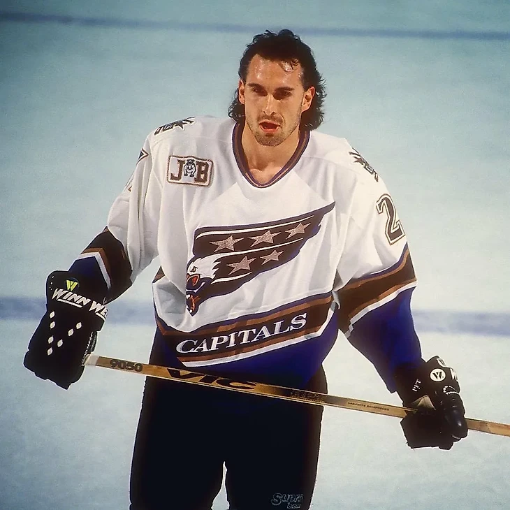 Форма. Всё просто и стильно - написали слово CAPITALS, букву "Т" стилизовали под клюшку, около клюшки положили (нарисовали) шайбу, сверху, помельче, написали Washington, чтобы не забывали, бросили горсть звёздочек - получите. Ещё раз обратите внимание на, представленную выше, фотографию Ивона Ламбре. А вот он же в гостевой ливрее. В то время домашние ливреи были белого цвета, а гостевые - "цветные".