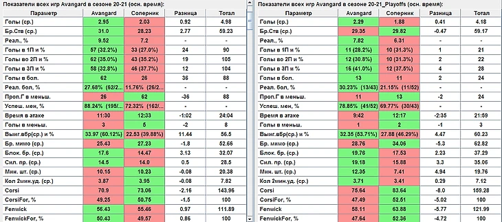 Изменились показатели при игре в неравных составах, но здесь, скорее, влияние дисперсии, а не реальное изменение цифр. Забивать в большинстве стали чуть чаще (27.68%/30.23%), но нужно понимать, что первый показатель взят из выборки в 60 матчей, а второй из 17. Если сравнивать эти числа для большой дистанции, то разброс не критичен и при игре в долгую должен вернуться к средним показателям. А вот провалы в меньшинстве слишком очевидны (88.24%/78.85%). Это заметно не только по разнице значений, но и по игровым моментам Авангард стал уступать против комбинационных розыгрышей.