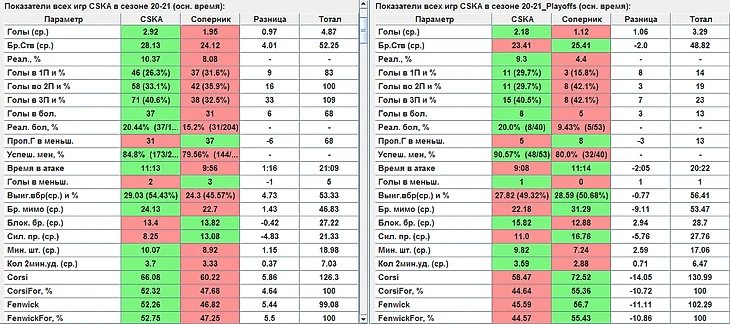 ЦСКА меньше времени проводит с шайбой (11:13/9:08), но это никак не мешает делать результат и оставаться лучшей командой на западе. Строгий и системный стиль не подразумает постоянного прессинга и нахождения в зоне атаке соперника(в т.ч. сказывается и на бросках в створ ворот).