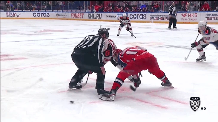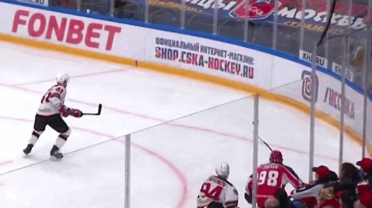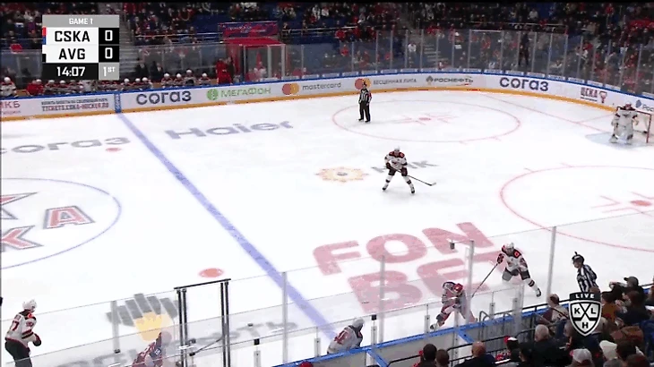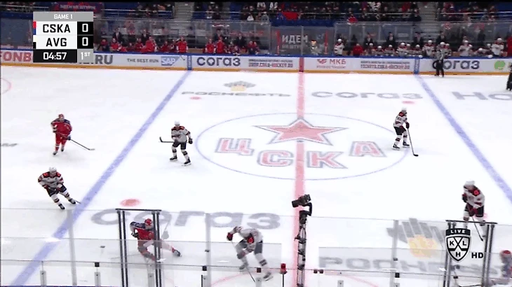 Тут «Авангард» показал, как в идеале должна действовать пятёрка. ЦСКА раскатился, начав атаку пасом на свой левый фланг. Его уже перекрывал Семёнов, поэтому Сошников двинулся по диагонали на правый край. Семёнов не отставал, а на своей синей уже находился Хохлачёв. Вброс, Готовец был первым на шайбе, и в несколько передач «Авангард» улетел в атаку.