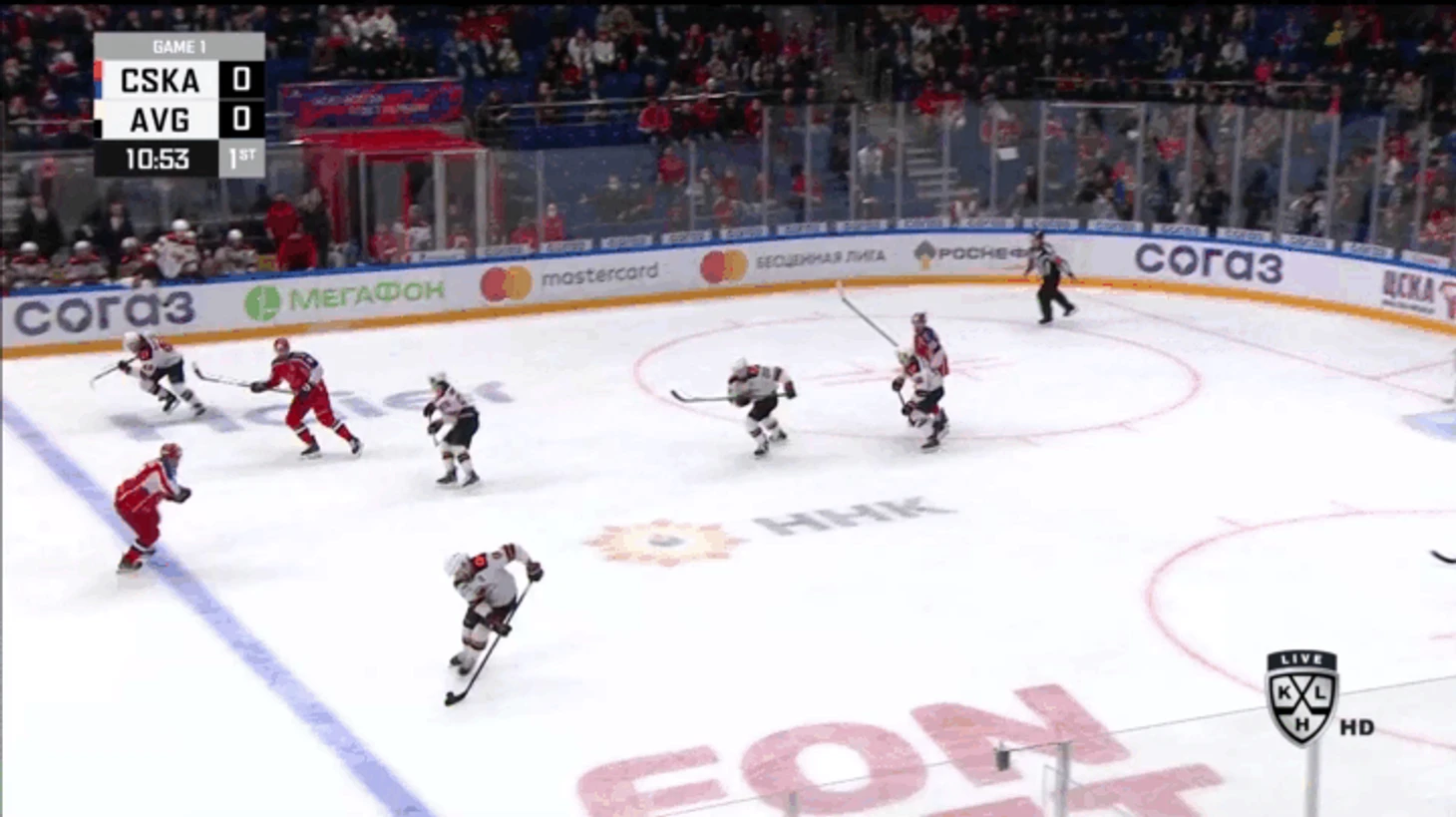 05:54 до конца первого периода – появляется Покка, за ним Шарипзянов и свежие форварды. Во время остановки игры Хартли поменял тройку нападающих, а защитников оставил играть дальше. 04:54 – Шарипзянов поднялся до красной линии за Маминым, пропустил за спину Шалунова и не успел назад. Эта пара обороны «Авангарда» продолжала переигрывать смены.